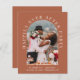 Chic Budget-freundliche Terracotta-Entdeckungsanzeige und Empfang Einladung. Die Vorderseite zeigt Ihr Foto in einem Bogenrahmen und "Happily Ever After Party" in eleganter weißer Typografie. Fügen Sie unter Ihrem Foto Ihre Vornamen, Ihr Hochzeitstermin und Ihren Ort hinzu. Auf der anderen Seite, personalisieren Sie Ihre Ankündigung und Einladung, fügen Sie Ihre Namen in ein signaturähnliches weißes Skript ein und geben Sie Ihre Website-Adresse, um einen scannbaren QR-Code für Ihre Gäste zu erstellen, um online zu scannen und weitere Details zu erhalten.