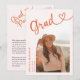 Feiern Sie einen denkwürdigen Meilenstein mit dieser personalisierten Abschluss-Ankündigungskarte, die zeitlos und herzlich wirkt. Die Vorderseite zeigt das elegante Wort Graduate in einer fließenden, verschnörkelten Schrift, vervollständigt durch einen zarten Herz-Schwung, der Wärme und Charme verleiht. Zentriert darunter ist das Foto des Absolventen in einer weichen, bogenförmigen Silhouette elegant gerahmt, wodurch ein raffinierter Mittelpunkt entsteht, der modern und doch klassisch wirkt. Vervollständigen Sie das Design mit individuellen Details wie dem Namen des Absolventen, dem Abschlussjahr und der Schule, die sorgfältig angeordnet sind, um eine saubere und ausgewogene Präsentation zu bieten.