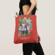 This beautiful arch frame photo Christmas tote bag features hand drawn floral elements in various shades of green, mint, teal, off-white. Included are pine, flowers, sprigs, leaves, berries along with modern hand lettered in off-white, reading, "Merry Christmas." The background color is a Christmas traditional, classical red. The back of the card has another place for a photo. Original Artwork by Caroline Bonne Müller