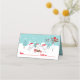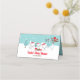 Diese niedliche und unterhaltsame Babydusche-Platzkarte besticht durch eine hübsche Arktis-Fuchsfamilie in einer wunderschönen Winterlandschaft mit schneebedeckten Bäumen und einem roten Vogel auf einem Zweig mit Heiliger. Die Füchse in Weihnachtsmannmützen fügen eine festliche Touch hinzu. Im Hintergrund ist ein aquamariner, blauer grüner Himmel und fallende Schneeflocken. Der Text verbindet dekorative und serifenlose Schriftart für einen stilvollen und modernen Look. Das ist perfekt für eine Babydusche zu Weihnachten.