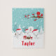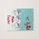 Dieses niedliche und lustige Rätsel kann mit einem Namen personalisiert werden. Es verfügt über eine bezaubernde arktische Fuchsfamilie in einer wunderschönen Winterlandschaft mit schneebedeckten Bäumen und einem roten Vogel auf einem Zweig mit Heiligen. Die Füchse in Weihnachtsmannmützen fügen eine festliche Touch hinzu. Im Hintergrund ist ein aquamariner, blauer grüner Himmel und fallende Schneeflocken.