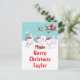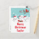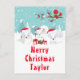 Diese niedliche und lustige Urlaubskarte kann mit einem Namen oder Titel wie Tochter, Enkelin, Nichte, Freund etc. personalisiert werden. Es verfügt über eine bezaubernde arktische Fuchsfamilie in einer wunderschönen Winterlandschaft mit schneebedeckten Bäumen und einem roten Vogel auf einem Zweig mit Heiligen. Die Füchse in Weihnachtsmannmützen fügen eine festliche Touch hinzu. Im Hintergrund ist ein aquamariner, blauer grüner Himmel und fallende Schneeflocken. Der Text verbindet dekorative und serifenlose Schriftart für einen stilvollen und modernen Look. Das ist perfekt zu Weihnachten.