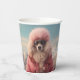 Das sonnige Bild eines King Poodle am Nordpol mit einem flauschig rosa warmen Wintermantel und einer Schneebrille