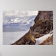 Später Frühling in Tromsø, Norwegen. Dramatischer Blick auf steil schneebedeckte Berge, die eisige Gewässer des Arktischen Meeres treffen und ein gefährliches und schönes Wunder namens Fjord schaffen.