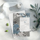 Ces invitations de mariage de 5 po x 7 po présentent un motif abstrait en feuilles dans les tons bleu ardoise poussiéreux, taupe et chocolat avec des espaces réservés, "Avec leurs familles, s'il vous plaît rejoignez", les prénoms de mariée et mariée, "pour leur mariage", date, heure, nom et adresse du mariage, "accueil à suivre".