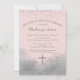 Une élégante invitation à la première communion rose et argent avec des confettis en parties scintillant argentée en haut et du glamour argenté en bas avec une croix en parties scintillant argentée.