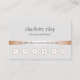 Des cartes LOYALTY élégantes et chic pour les studios de massage, massothérapie, centre de beauté, spas ou professionnels du bien-être présentent une illustration de bandes or rose sur un arrière - plan gris argenté et six cercles punchout en blanc avec bordure d'or rose. Customisez l'avant avec deux lignes de texte personnalisé sur et ajoutez vos coordonnées complètes à l'arrière en utilisant le modèle. Un design chic pour toute industrie du bien-être ou profession holistique de la santé