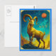 Postkarte in einem majestätischen Widder stehend auf felsigem Gelände, symbolisiert das Sonnenzeichen Aries. Set vor einem kosmischen Hintergrund mit leuchtenden Mars auf dem roten Planeten, die kühlen Hörner des Widders und der intensive Blick erwecken Kraft, Mut und einen feurigen Geist.