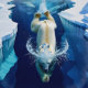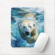 Arktische Illusion: Der schwimmende Monarch. Ein atemberaubendes visuelle eines majestätischen Eisbären, der aus dem eisigen Wasser auftaucht, gefangen in fließend stilisierten Wasserfarbenstrichen. Das Zusammenspiel von Licht und Wasser erzeugt einen ätherischen Effekt, als ob der Eisbär zwischen zwei Welten existiert - Realität und Traum.