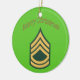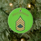 Armeediener Erste Klasse Weihnachtsschmuck. Dieses Ornament ist auf der einen Seite mit den Insignien des Armeeoffiziers der ersten Klasse und den Worten "Frohe Weihnachten" und auf der anderen mit dem Weihnachtsmann mit einer Tüte Goodies dekoriert.