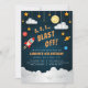 Les invitations à la fête d'anniversaire sur le thème de l'espace cool comprennent un navire-fusée, des étoiles, des planètes et des nuages contre un arrière - plan du ciel nocturne, avec "3, 2, 1..."blast off" en bande dessinée brillante style lettering. Personnalisez avec les détails de votre fête d'anniversaire sous.