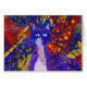 Un minou pourpre de smoking se repose avec ses pattes d'une manière ordonnée pliées. Derrière lui rouge, les corrections jaunes, oranges, bleues et vertes de couleur forment un arrière - plan délicieux et vivant. Flashes du filet de chaux, de cramoisi, ambre et violet par la peinture. Les triangles, les points, les filets et les cercles se précipitent par la fiesta de l'entrée de taches de rousseur dans le ciel. Des larmes de lavande et d'indigo sont versées pour son dépassement, quoiqu'il y ait beaucoup de joie à son arrivée.