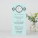 Eine Menükarte, die ihren Einfluss aus der Art-Déco-Ära nimmt. Eine verzierte Band, die wie eine Viktorianische Armbanduhr aussieht, verfügt über eine Medaille, in der das Mongramm des Paares gehalten wird. Der helle Aquahintergrund druckt ein subtiles Muster als Wasserzeichen. Hinzufügen oder Verkleinern von Leerzeichen zwischen den ersten und letzten Initialen, um das mittlere Monogramm auszugleichen. Fügen Sie unten ein individuelles Menü hinzu. Ein klassischer Look zum Set der Stimmung für jede Hochzeit. Erhältlich in alternativen Farben mit passenden Produkten.