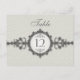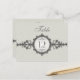 Eine Tischkarte, die ihren Einfluss aus der Art-Déco-Ära nimmt. Eine verzierte Band, die wie eine Viktorianische Armbanduhr aussieht, verfügt über eine Medaille, die die Tischnummer oder den Buchstaben mit dem anpassbaren Wort "Tisch" darüber hält. Der Untergrund druckt ein subtiles Muster als Wasserzeichen. Doppelseitige Konstruktion für Komfort aus jedem Winkel. Erhältlich in alternativen Farben mit passenden Produkten. com.