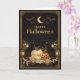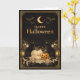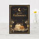 A glamorous Art Deco–inspired Halloween illustration in rich black and radiant gold. A crescent moon and shimmering stars illuminate the night sky as graceful bats glide overhead. Framed by bold geometric borders, two elegant black cats sit symmetrically beside glowing lanterns and a cluster of heirloom pumpkins, including a smiling jack-o’-lantern softened by floral accents. The refined typography and metallic palette evoke Jazz Age sophistication, blending Halloween charm with timeless luxury.