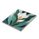 This ceramic tile features a stylized calla lily in a classic Art Deco style, with graceful white petals, warm golden centers, and layered green and teal leaves set against a deep blue background. The artwork is printed on a smooth tile surface, keeping the colors crisp and the lines clean. It works beautifully in many settings: displayed on a tabletop or easel, added to a wall arrangement, incorporated into kitchen or bathroom tilework, used on stair risers, or included in covered outdoor spaces away from direct sunlight. It can also be used in furniture inlays, framed as wall art, or grouped with other tiles to create a striking pattern. A versatile piece that brings a touch of vintage charm and botanical elegance to any space.