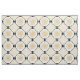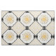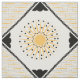 Das originelle Muster dieses maßgeschneiderten Stoffes wurde von Leslie Sigal Javorek & inspiriert durch Art Deco der 20er Jahre. In einem cremefarbenen Hintergrund ist das mittlere Medaillon des sich wiederholenden Musters ein heller Sonnenblumengelb stylisierter Sonnenbrand mit scharfkantigen Strahlen. Die schwarzen Foto-Ecken, die von einem schwarzen Plektrum umgeben sind, sind Set für Punkt, und in jeder der 4 Ecken sind die Blöcke von mehreren feinen schwarzen Linien, die sich abwechselnd in Richtung und durch horizontale gelbe Sonnenstrahlen getrennt.