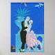 Kiss Art Déco De Minuit. Illustration Art Déco de 1921. L'artiste français Georges Barbier est célèbre pour sa belle et vivante représentation de la vie nocturne parisienne. Midnight Kiss représente un couple debout sur un balcon surplombant la rivière comme un bateau navigue au loin. L'homme porte un smoking noir et se penche pour un baiser tandis que la femme porte une robe rose frileuse, un arc rose et des cheveux roses. Deux colombes bleues volent au-dessus d'elles dans le ciel nocturne. Un cadeau romantique pour les fans de Georges Barbier, Art Déco et Paris Vintage.
