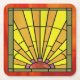 Set aus 6 quadratischen Zellstoffplatten Einweg-Untersetzer mit einem Bild eines Art-Déco Buntglases mit goldenen Lichtstrahlen, die von einer roten Orangensonne ausgehen. Siehe dazu passender Untersetzer aus Kunststoff und Servietten. Sehen Sie sich die gesamte Roaring 20s Untersetzer-Kollektion im NAHRUNGSMITTEL/BEV an. | Abschnitt "Untersetzer".