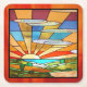 Set aus 6 quadratischen Untersetzer aus Zellstoffplatten mit einem bunten Farbbild aus Art-Déco-Farbglas; eine Landschaft mit sanften Hügeln, einem See oder Ozean, Bäumen und einer aufgehenden Sonne. Siehe passende Untersetzer aus Kunststoff und Servietten. Sehen Sie sich die gesamte Roaring 20er Untersetzer Kollektion im NAHRUNGSMITTEL/BEV an| Untersetzer