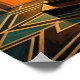 A classic portrait of Jazz Age sophistication and mystery. This striking artwork features a black silhouette of a gentleman in a top hat and formal coat, holding a cane while standing confidently upon a tiered Art Deco pedestal. Framed by a radiant golden sunburst that transitions into a deep teal archway, this piece captures the timeless glamour of a 1920s evening. Perfect for a modern office, home bar, or as a statement piece in a minimalist interior.