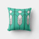 Dieses Kissen hat ein Kunstfenster aus Deko, in dem Diamanten und Linien in Weiß, Schwarz und Türkis gestaltet sind.