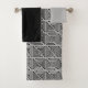 Dieses Set ist mit einem grauen Waschlappen, einem schwarzen Handtuch und einem Art-Déco-Design aus einem rechten Winkel mit einem Labyrinth-Set in schwarz auf einem grauen Feld ausgestattet.