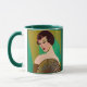 Die Tasse des Kaffees in einer modernen, halbabstrakten Art Déco inspirierte das Porträt einer Dame, die einen Fan hält, vor einem Hintergrund in Jade, Grün und Gold