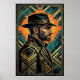 Add an air of mystery and classic cinematic style to your walls with this Art Deco noir detective portrait. Featuring a sharp, geometric profile of a man in a fedora and trench coat, set against a radiant golden sunburst and deep teal geometric frame. This piece captures the suspenseful glamour of 1920s crime dramas, making it ideal for a modern office, study, or sophisticated lounge.