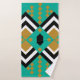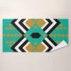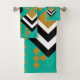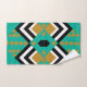 Dieses Handtuchhandtuch-Set hat ein kunstvoll inspiriert Deko-Design von Diamantformen in schwarz, weiß und gold auf einem türkisfarbenen Feld.