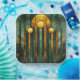 Schöne, Vintage Deko Teller mit geometrischen Mustern in den Farben Grün, Türkis und Gold. Das Bild zeigt die aufgehenden Wolkenkratzer von Sonne und Stadt.