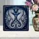 This stunning ceramic tile features a captivating Art Deco design showcasing two majestic seahorses rendered in a lustrous mother of pearl effect against a deep blue background. The intricate linework and symmetrical composition evoke a sense of timeless elegance and oceanic wonder. Each seahorse is meticulously detailed with a mosaic-like pattern, reflecting light beautifully and adding a luxurious shimmer. The surrounding ornamental details, reminiscent of vintage aesthetics, enhance the overall sophistication, making this tile a unique statement piece for any home decor. Perfect for creating a focal point in bathrooms, kitchens, or as an artistic accent wall, this tile brings the enchantment of the sea with a touch of refined glamour.