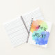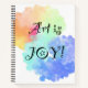 Kunst ist Freude auf einem Notizbuch. Hell, farbenfroh, Aquarelltöne, pastellfarbene Wolken, blühen als Hintergrund für lustigen schwarzen Text. Inspirative glückliche Worte über eine helle Regenbogenwolke.