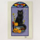 Eine schwarze Katze sitzt auf einem Haufen Bücher mit roter Kerze, Kürbissen, mit Augen Sushi und einem Schmetterling aus Fleckglas in lila und hellgelber Umgebung.