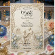 Capture the timeless elegance of a fairytale union with this heritage-style design, featuring a romantic garden scene in a soft, monochromatic ivory palette.This design draws inspiration from the grandeur of early 20th-century craftsmanship, presenting a sophisticated visual narrative. The background simulates a sculpted limestone surface, creating a high-fidelity visual texture of bas-relief masonry. Central to the composition is a classically rendered scene of a groom kneeling before a bride within a formal architectural gazebo, surrounded by a cobblestone path. The imagery is framed by quintessential Art Nouveau biological curves, featuring swirling vines and delicate pastel blue tulips that break the monochrome ivory and cream spectrum. The typography hierarchy balances formal serif headers with elegant calligraphy script for names, ensuring legibility against the textured backdrop.This is a flat printed image with a faux carved stone effect, not actual raised material or deep embossing.