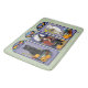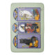 Eine schwarze Katze, mit, Scheunenuhu alle in Halloween themed arched art nouveau dunkle lila Grenze. Schmetterlinge, Kürbis, Bücher, Kessel, Kessel, wilgelbe Blumen, Pilze, Kerzen und Kerzen, die die drei in einem hellen Rahmen verbinden