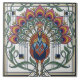 This stunning ceramic tile features a vibrant Art Nouveau-inspired peacock design, showcasing its magnificent fanned tail feathers adorned with intricate floral patterns. The rich color palette of blues, oranges, pinks, and yellows pops against a clean white background, framed by elegant green foliage and geometric accents. Perfect for adding a touch of vintage charm and sophisticated elegance to any space, this tile tells a story of natural beauty and artistic craftsmanship. Its detailed illustration and unique aesthetic make it a captivating focal point for kitchens, bathrooms, or any decorative wall project.