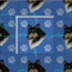 Eine künstlerische Skizze des Kopfes einer glücklichen Rough Collie mit einem blauen Hintergrund mit Pfotendrucken und Spuren in Grautönen, Rosa und Blau. Design von Diane Blackman. Das gleiche Design ist auch bei anderen lustigen Hundebildern erhältlich.
