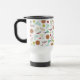 Une tasse avec un motif à thème artisanal. Le design se compose d'une boule de fil avec aiguilles de tricot, boutons, ciseaux, une bouteille de parties scintillant, une bouteille de colle, ruban, et un pistolet à colle chaude. Le design a une palette de couleurs rétro orange, jaune, rouge et bleu/turquoise.