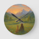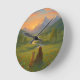 Wall clock featuring a beautiful image of a woman and her pet enjoying stunning scenery.