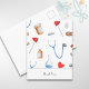 Vielen Dank für Ihre Karte für das Gesundheitspersonal. Mit einem schönen handgezeichneten Muster medizinischer Ausrüstung, ist diese Postkarte perfekt zum Geburtstag, danke oder denken Sie an Sie. Personalisieren Sie den Text bei Bedarf mit Ihrer eigenen Nachricht. Illustriert und entworfen von Patricia Alvarez.
