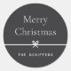 Lassen Sie Ihre Ferien-Mailings und Geschenke mit diesen süßen und einfachen Weihnachtsaufklebern abschließen, die mit Ihrem bevorzugten Urlaubssgruß und Familiensignatur (mit "Frohe Weihnachten" gezeigt) auf einem weichen Asche schwarzen Hintergrund angepasst werden können. Ein kleiner Bogen, der durch das Zentrum läuft, vervollständigt dieses elegante minimalistische Urlaubsdesign.