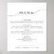 Dieses bedruckbare Hochzeitsmenüzeichen besticht durch einen eleganten Kalligraphie-Schriftart und ein modernes Minimaldesign mit vollständig bearbeitbarem Text. Ändern Sie einfach die Schriftart, die Schriftart- und Hintergrundfarbe, um sie Ihrem Veranstaltungsstil anzupassen. Die einfache Schwarz-Weiß-Farbkombination macht es zu einer perfekten Ergänzung zu jedem Event. Nutzen Sie dieses Plakat für Ihre Hochzeitsfeier, Ihr Brautparty, Ihre Paardusche, etc.