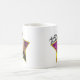 Weiße Tasse mit schwarzem und rosa Sternlogo.
