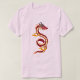 Ein rosa T - Shirt mit einem roten und gelben Drachendesign an der Vorderseite. Der Drache ist in S-Form gebacken, und Flammen kommen aus seinem Körper. Der Drache hat einen roten Kopf mit schwarzen Hörnern und einer gelben Kontur. Der T - Shirt ist schlicht und einfach, mit einem Crew Hals und kurzen Ärmeln. Der Hintergrund ist eine hellrosa Farbe.