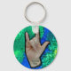 Handgemalte Seide ist der Hintergrund für dieses Schlüsselanhänger-Design mit dem Handzeichen der amerikanischen Zeichensprache "I Liebe You".