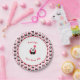Ce panda souriant a un ballon rouge pour célébrer l'anniversaire d'un enfant d'un an. Texte modifiable - ajoutez un nom et un message d'anniversaire par exemple. Il y a un motif de pandas plus souriants sur un arrière - plan rose pâle autour du bord de l'assiette.