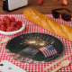Sparklers in a glass jar illuminate the scene alongside a small American flag, set against a red and white checkered tablecloth