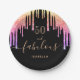 Une assiette en papier 50e anniversaire tendance et glamour. Un arrière - plan noir classique décoré avec des gouttes de parties scintillant irrégulière de couleur arc-en-ciel, la peinture goutte à goutte dans l'or violet, rose et rose. Avec le texte : 50 et fabuleux. Personnalisez et ajoutez un nom. Texte de couleur dorée. Le mot Fabulous est écrit avec un script de style à la main moderne avec des swashes. Des serviettes en papier assorties sont disponibles dans notre magasin.