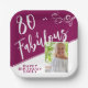 80 et fabuleux Script Photo Magenta 80th Birthday Paper Plates. Écriture blanche tendance et feuillage blanc avec photo personnalisée. Faites vos propres plaques de papier de fête de 80e anniversaire pour elle. Customisez avec le nom et l'âge et insérez votre photo dans le modèle.